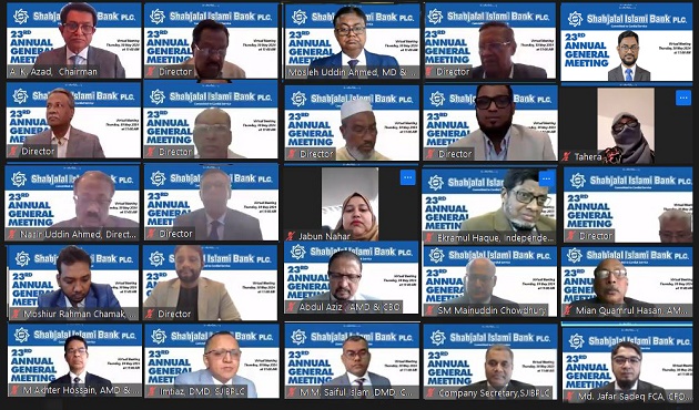 The 23rd Annual General Meeting (AGM) of Shahjalal Islami Bank PLC. held on 30th May 2024 through Digital Platform (with Online Video Conference). The Chairman of the Board of Directors of the Bank Mr. A. K. Azad, MP presided over in the meeting. The Annual General Meeting (AGM) approved 14 percent Cash dividend for the Shareholders and the Directors reported & audited Balance Sheet and the profit & loss account for the year ended on 31st December 2023. The Chairman of the Board of Directors of the Bank Mr. A. K. Azad, MP & the Managing Director Mr. Mosleh Uddin Ahmed delivered speech in the Annual General Meeting (AGM). The SEVP & Company Secretary of the Bank Mr. Md. Abul Bashar moderated the program.