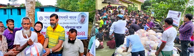 Shahjalal Islami Bank Limited distributed relief among 1000 (one thousand) families affected by floods in different areas of Sylhet and Sunamganj districts from 22 June 2022 to 24 June 2022 as part of Bank’s CSR program. Under the overall management & supervision of Sylhet Branch, Dargah Gate Branch and Subidbazar Branch of Shahjalal Islami Bank Limited, the relief materials were distributed among the flood victims by the Bank Foundation. As relief each family got Chira-2 kg, Muri-1 kg, Toast Biscuit-1 packet, Molasses-500 gm, Saline-1 box, Mineral water-2 liters, Candles-1 packet and match-1 box.